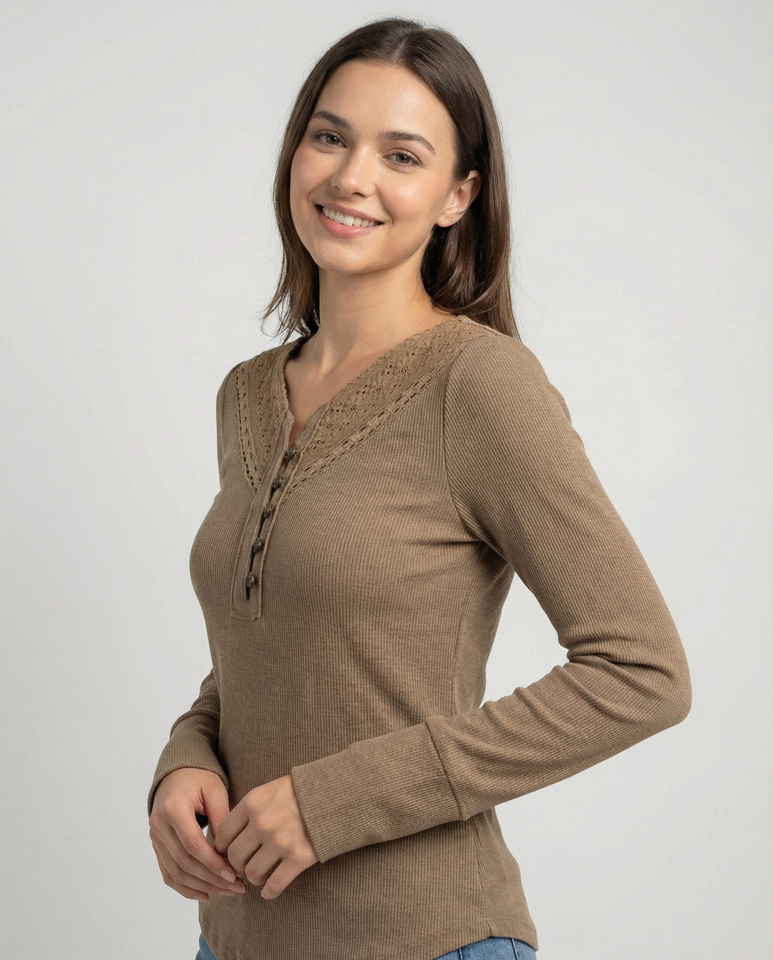 Eyelet Stitch V-Neck Long Sleeve Knit Top