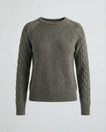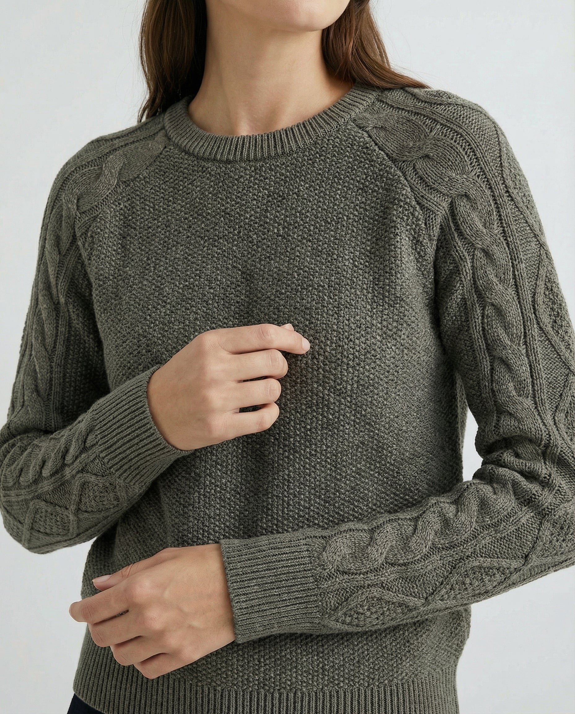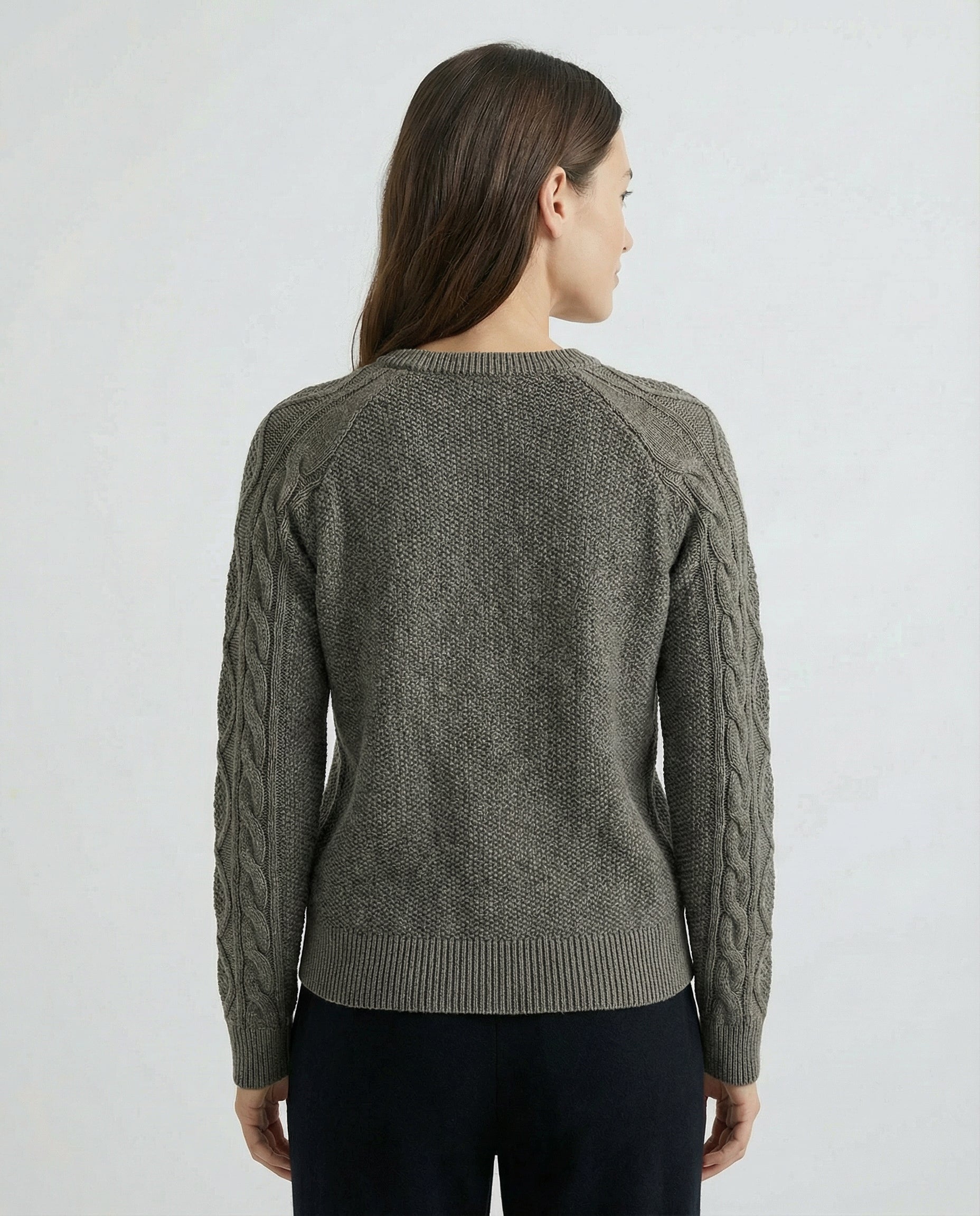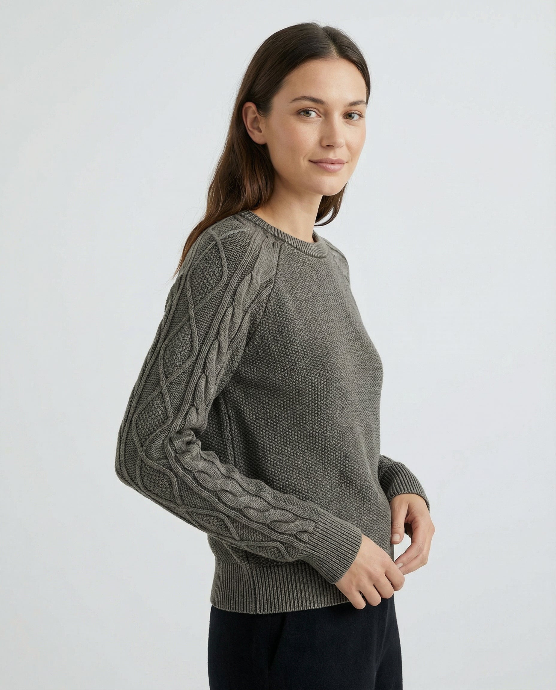 Design: Smooth body with contrast cable-knit sleeves