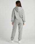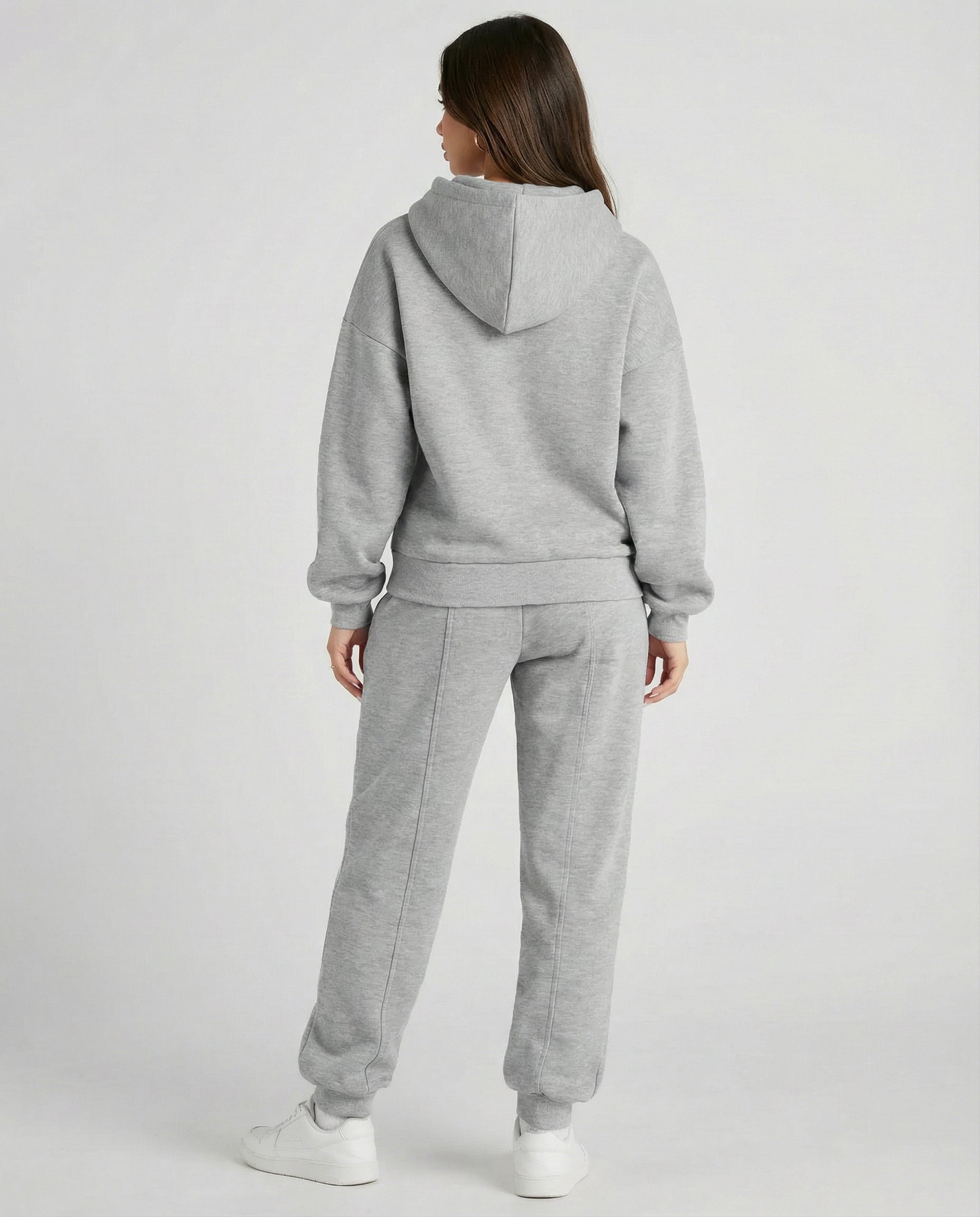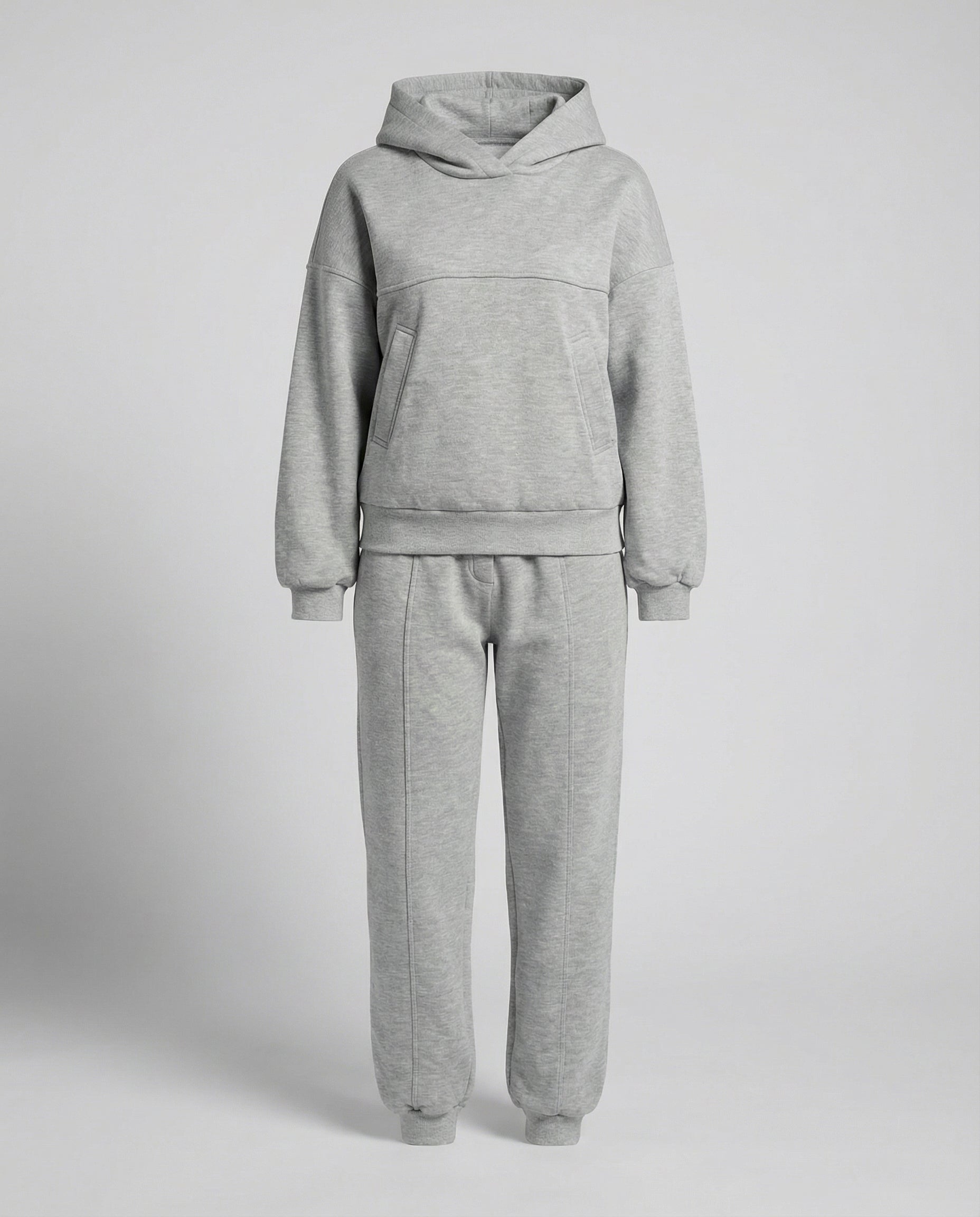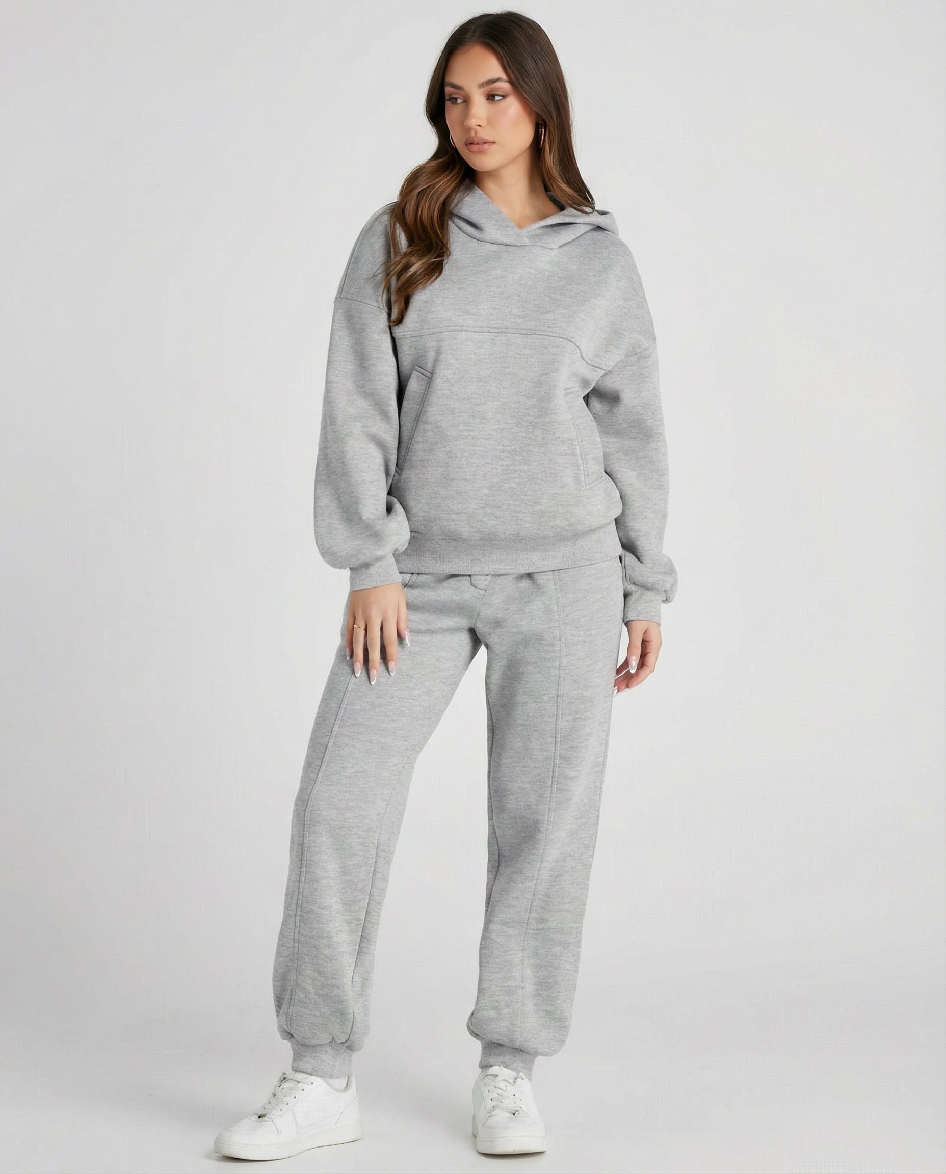 Design: Dropped-shoulder long sleeve hoodie with relaxed sleeves and matching pull-on pants for a clean, coordinated athleisure look.
